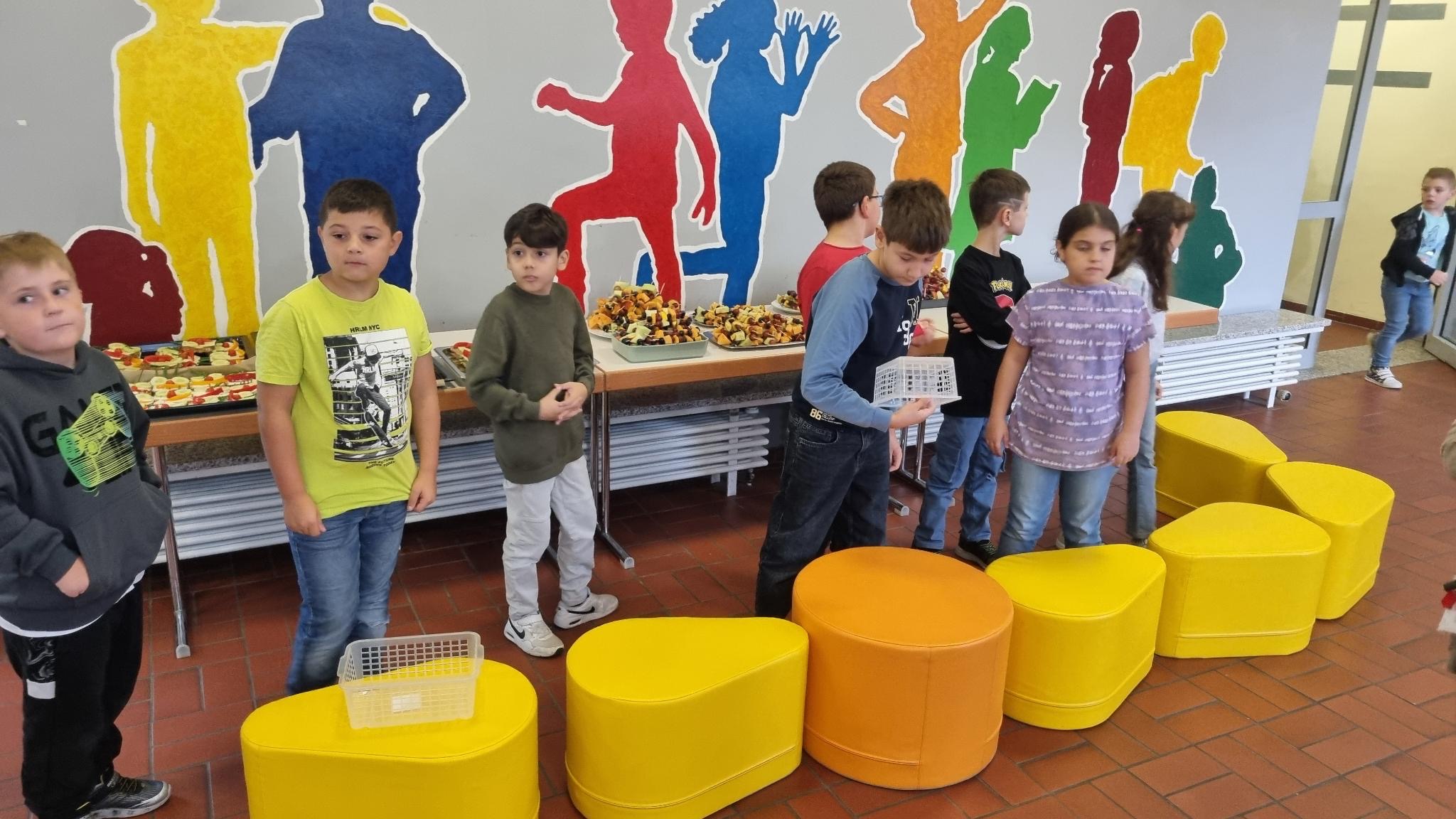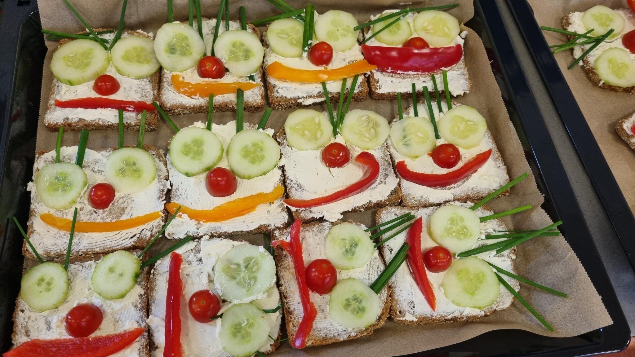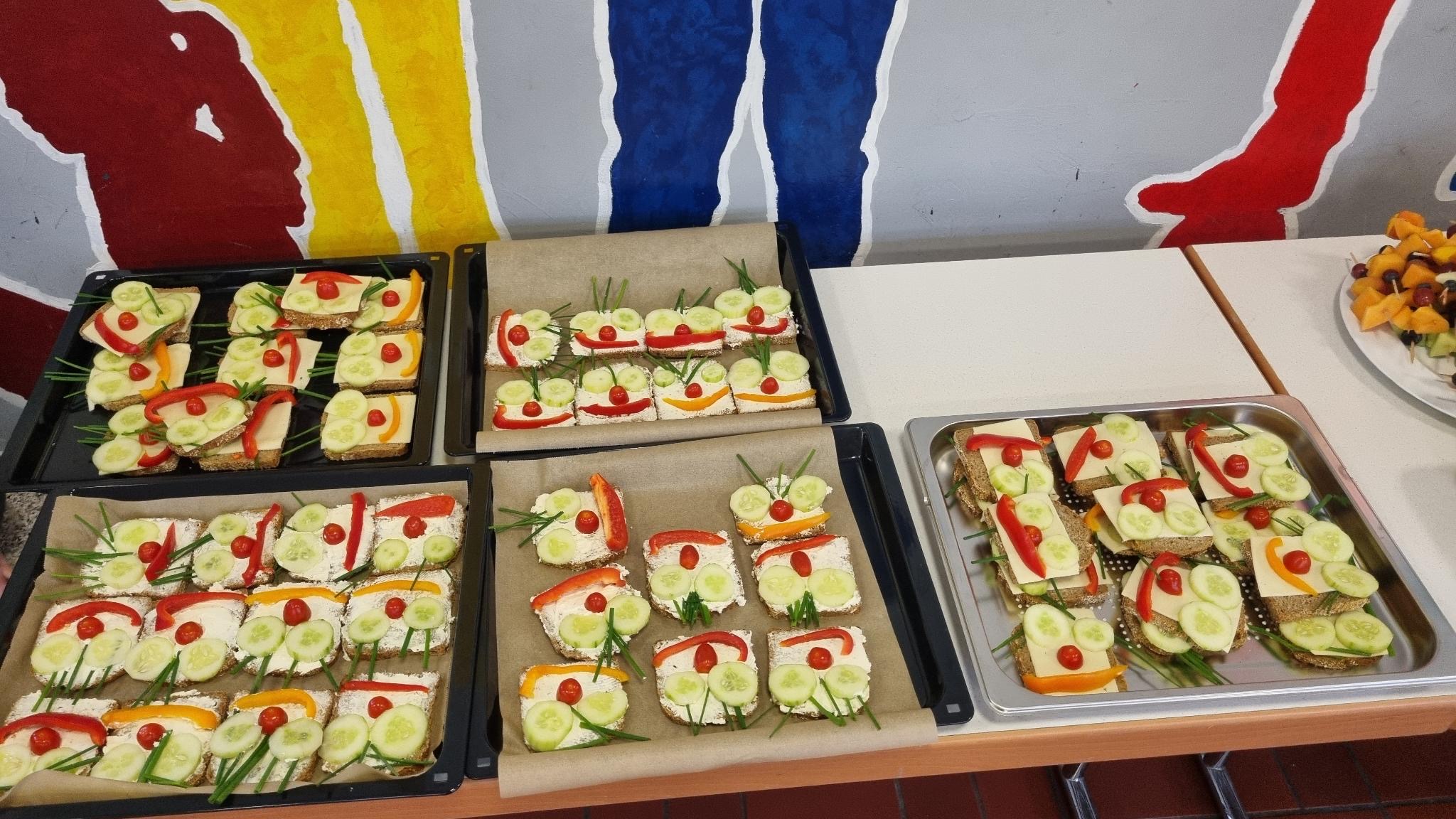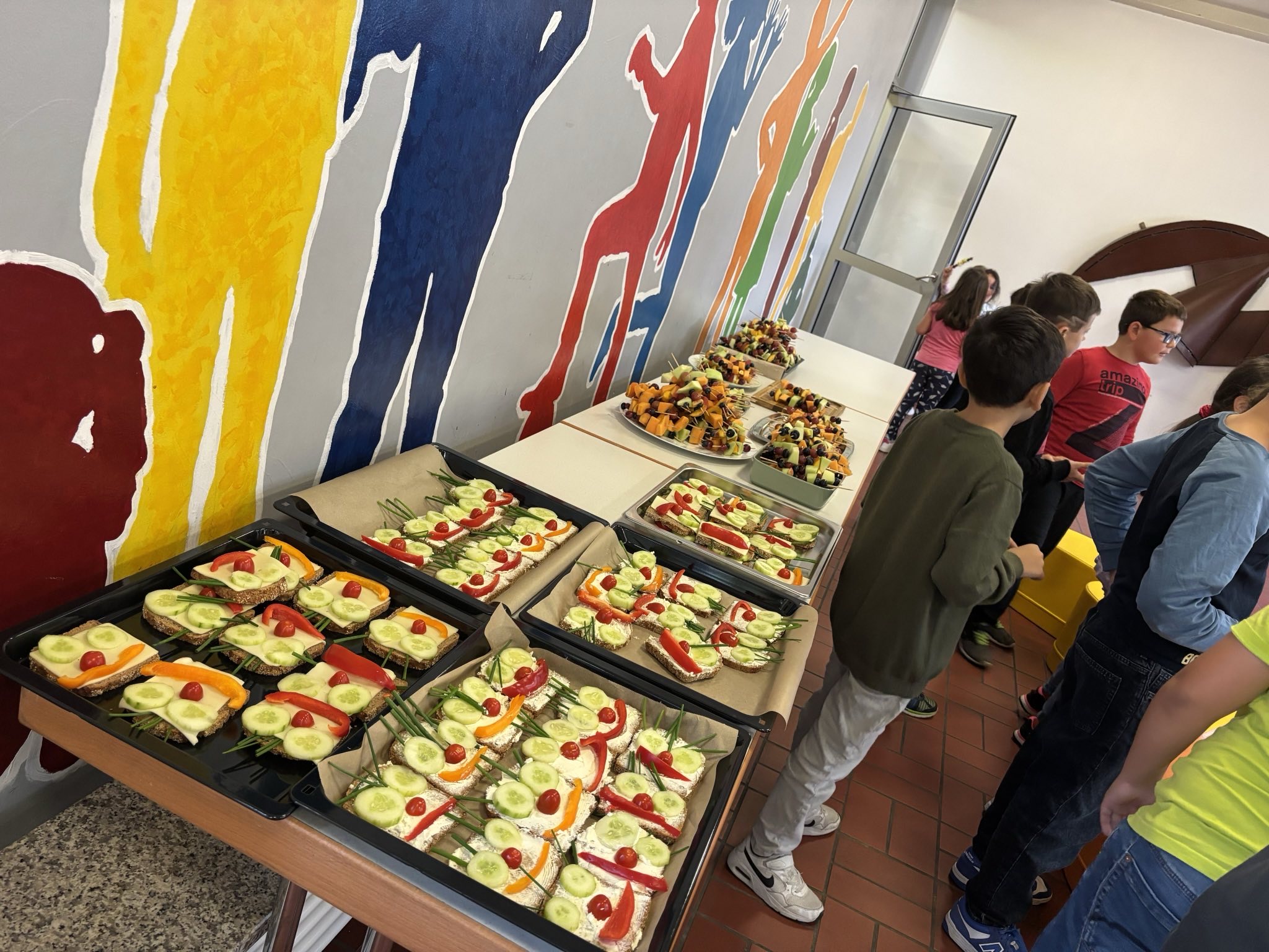 Im Rahmen der Sachunterrichtseinheit „Ernährung“ bereiteten die 3. Klassen am Dienstag, dem 23.9., für die ganze Schulgemeinschaft ein gesundes Frühstück zu. Es gab lustige Brotgesichter mit