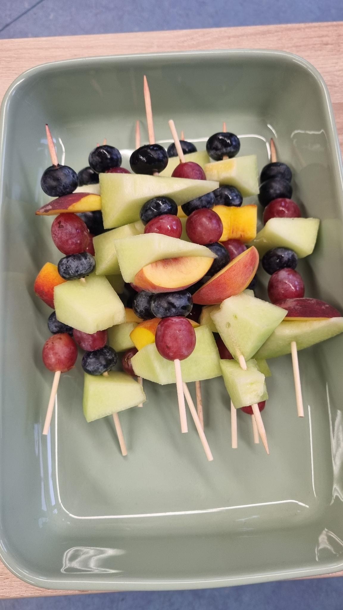 Frischkäse und Gemüse sowie leckere Obstspieße.