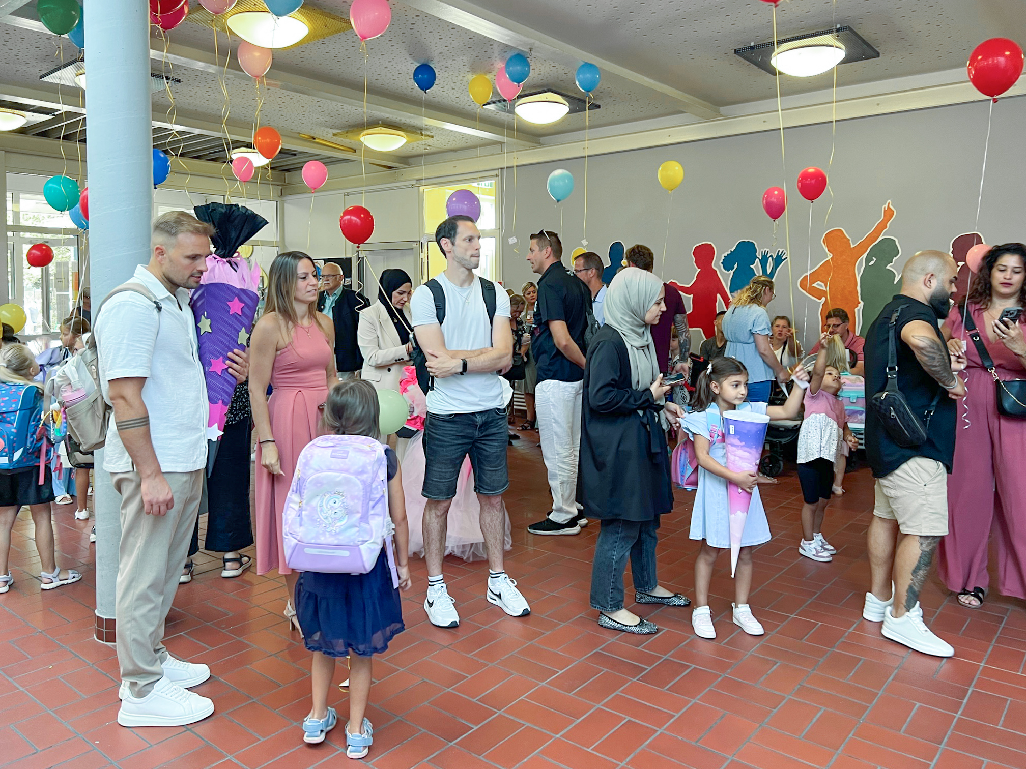 Nach dem Programm ging es für die Erstklässler mit ihren Klassenlehrerinnen und Klassenlehrern in die neuen Klassenzimmer. Währenddessen konnten die Familien Sekt,
