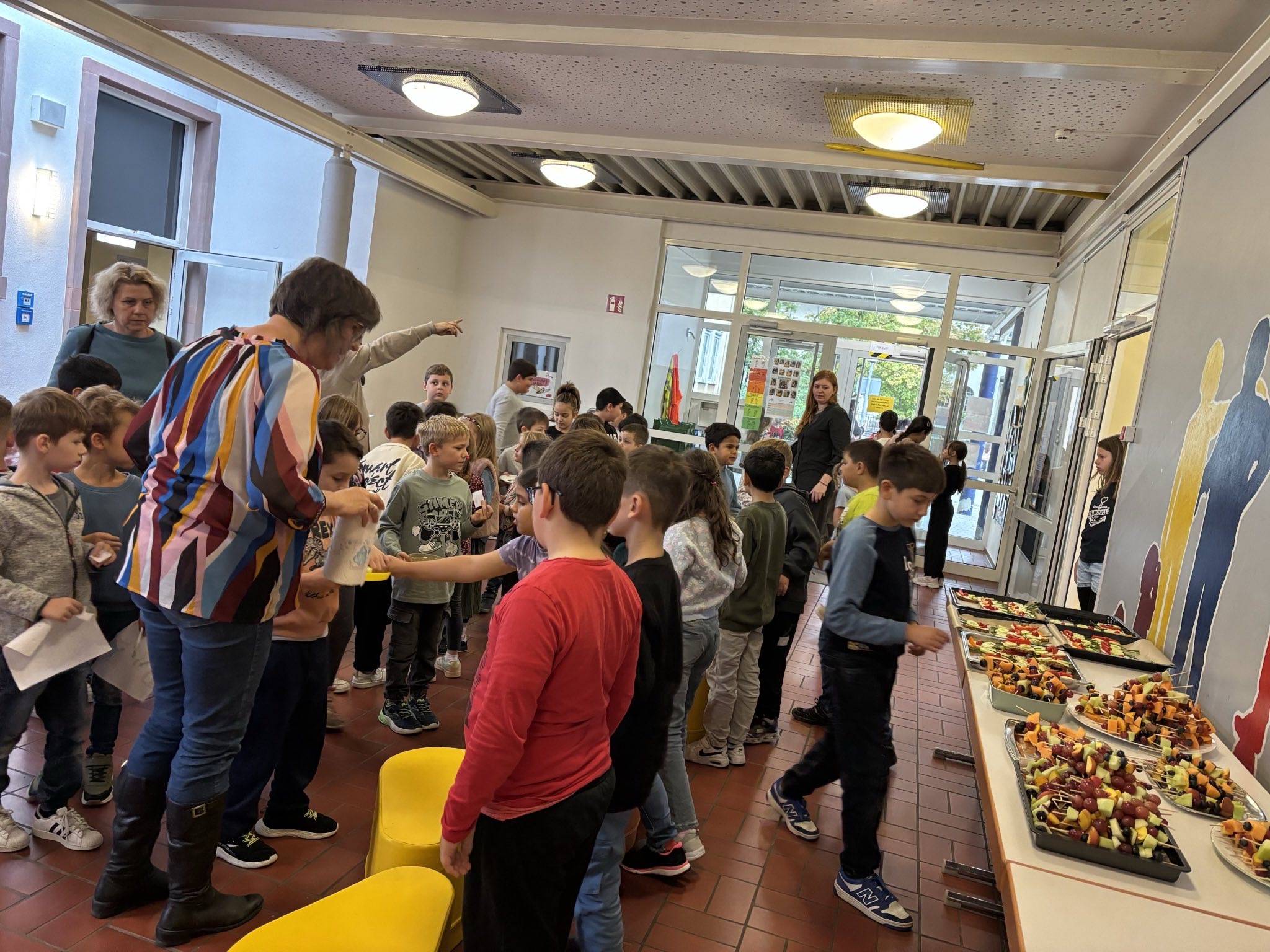 Während der großen Pause durfte sich jeder Schüler in der Pausenhalle gegen Eintausch eines Bons ein Brot oder einen Spieß abholen.